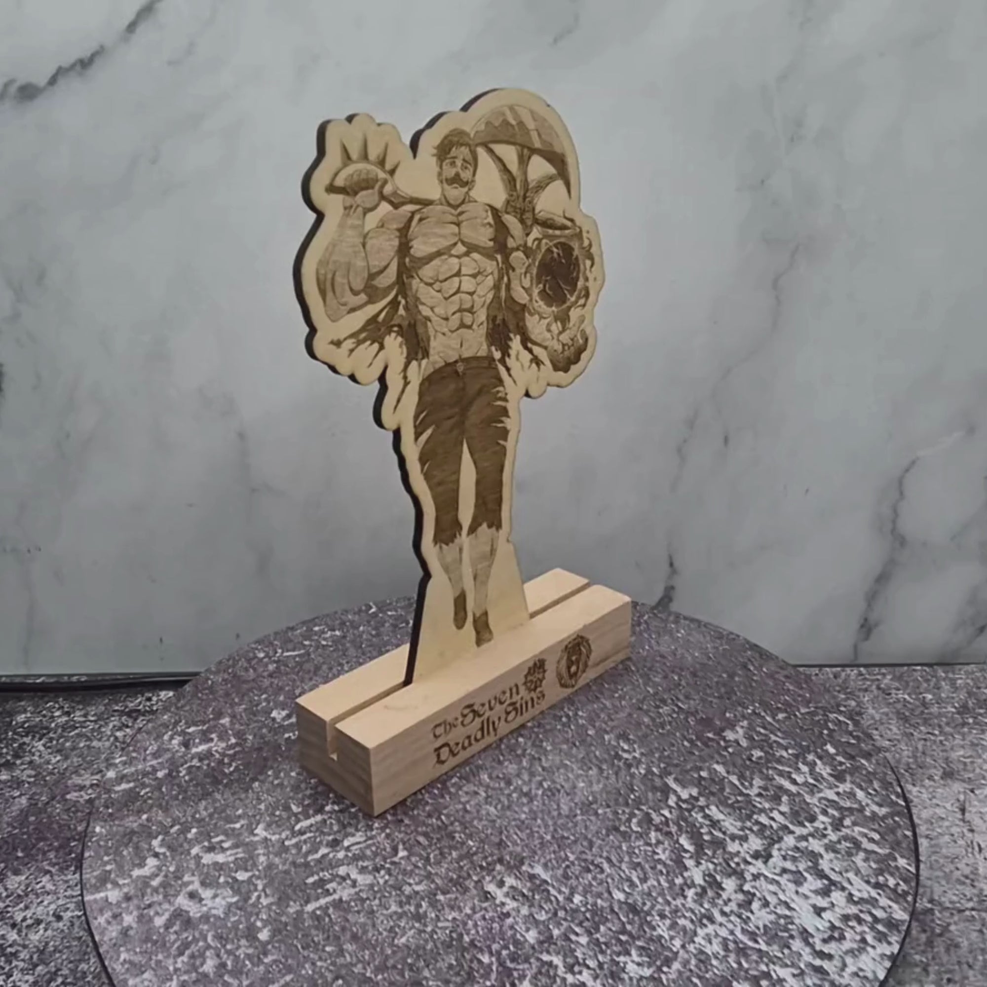 Each stand is carefully laser-engraved and finished by hand, offering a warm, natural alternative to acrylic anime stands. The minimalist silhouette captures Escanor’s imposing stature and confidence, while the natural wood grain adds depth and individuality to every piece.